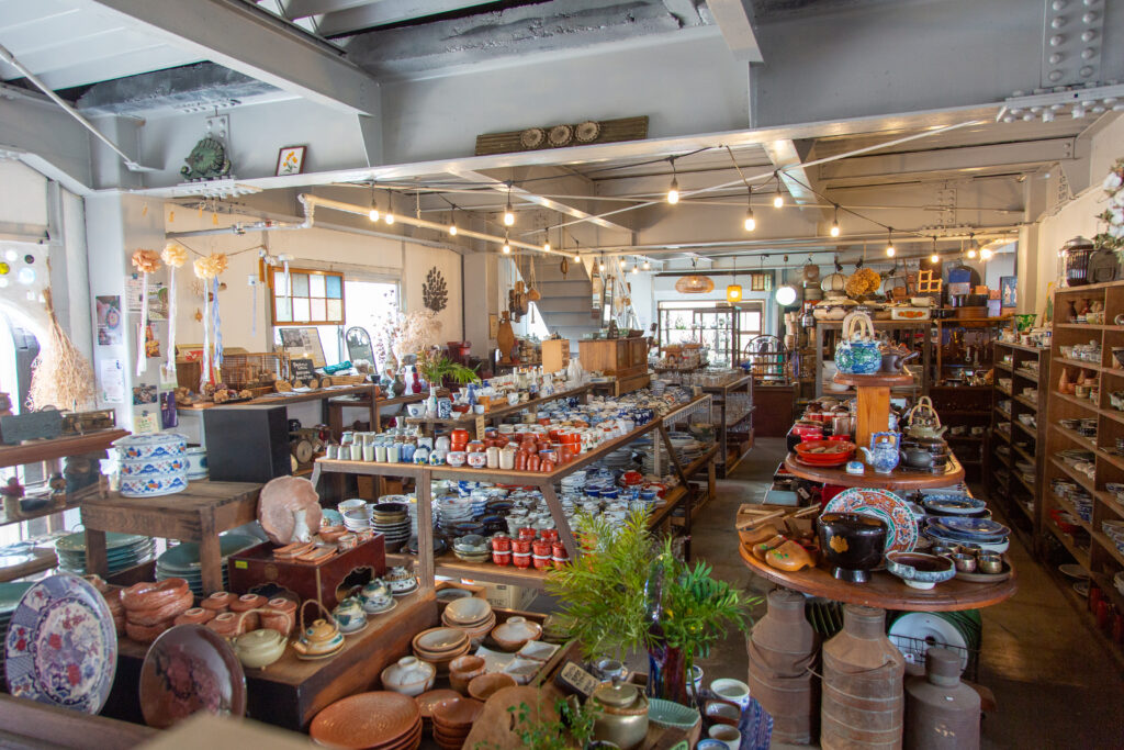 たくさんの陶器が並ぶ店の内部。棚やテーブルの上にお皿や茶碗、急須などが陳列されている。